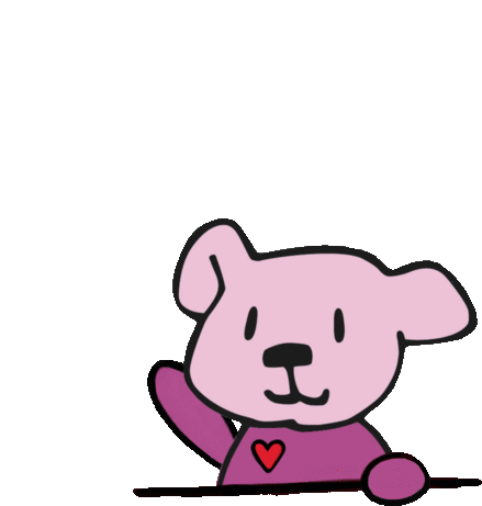 A cute pink cartoon bear from Bärenherz Children's Hospice waves hello, showing a red heart on its chest.