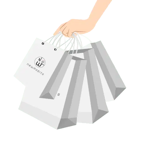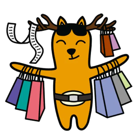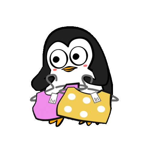 A cute penguin choosing clothes and a happy cat pushing a shopping cart, celebrating a fun day of shopping.