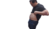 A man from Porta Dos Fundos playfully jiggles his belly, creating a silly and humorous moment.