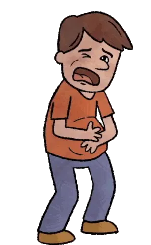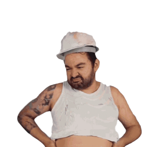 A man with a beard, hard hat, and tank top reacts to his big belly, making a disgusted or uncomfortable face.