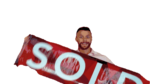 Barry Wheeler, a real estate agent, smiles while holding a large red 'SOLD' sign, celebrating a successful property sale.