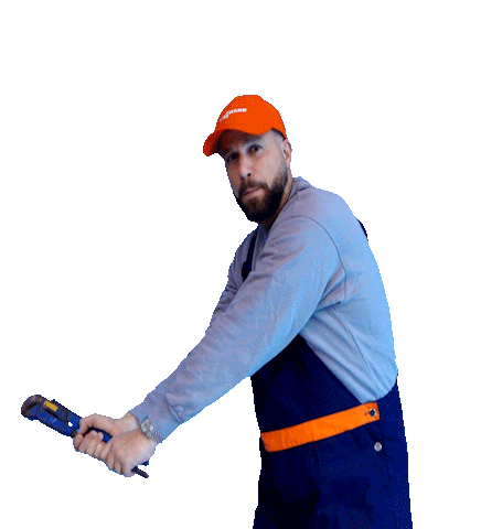 A focused plumber in blue overalls and a red cap holds a wrench, looking upwards as if inspecting or fixing something.