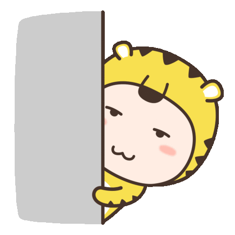 A cute cartoon character in a yellow tiger costume peeks from behind a wall, displaying a bashful and shy smile with rosy cheeks.