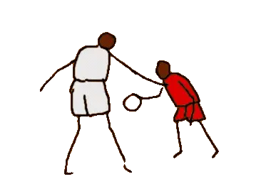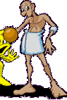 A cartoon features a thin, bald man in a towel next to an angry yellow character and a basketball, related to dribbling.