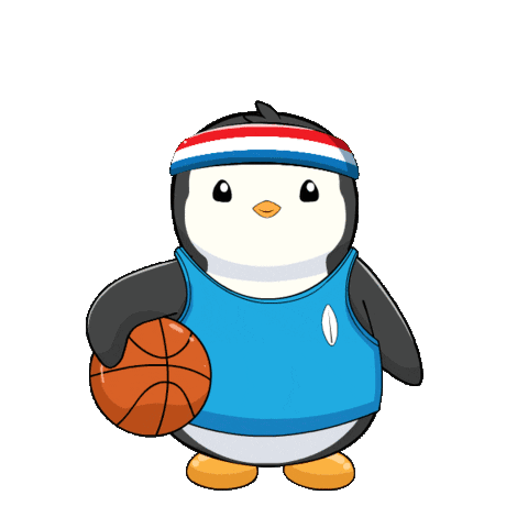 A cute cartoon penguin, wearing a basketball jersey and headband, skillfully spins a basketball on its finger.