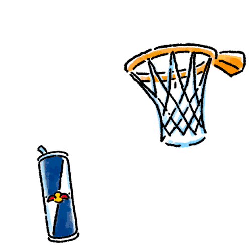 An animated Red Bull can shoots a basketball into a hoop, scoring a point with energy.
