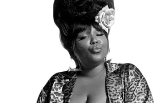 Lizzo, with her "Bat Lashes" and a glamorous beehive hairstyle adorned with a flower, makes a cute, flirty kissing face.
