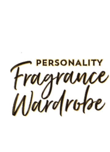 Animated sticker featuring the elegant text 'Personality Fragrance Wardrobe' in black and gold, perfect for beauty themes.