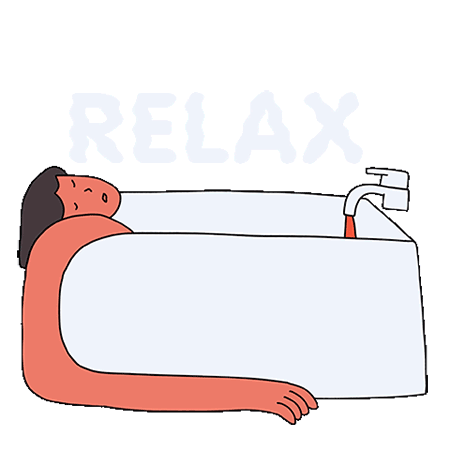 A person unwinds in a bathtub, with the word 'RELAX' floating above, enjoying a peaceful moment of self-care.