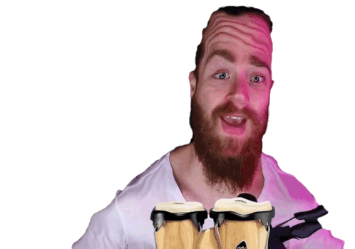 Luba playing bongo drums with a comically distorted face and exaggerated smile, creating a funny and energetic sticker.
