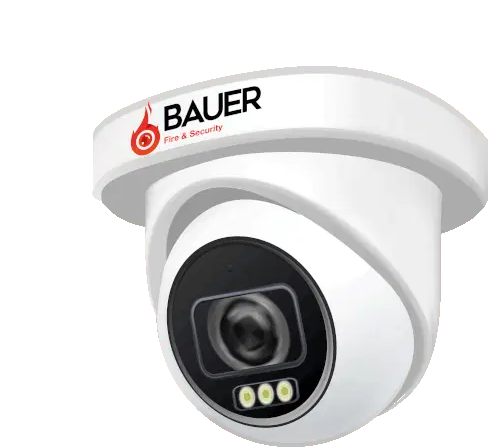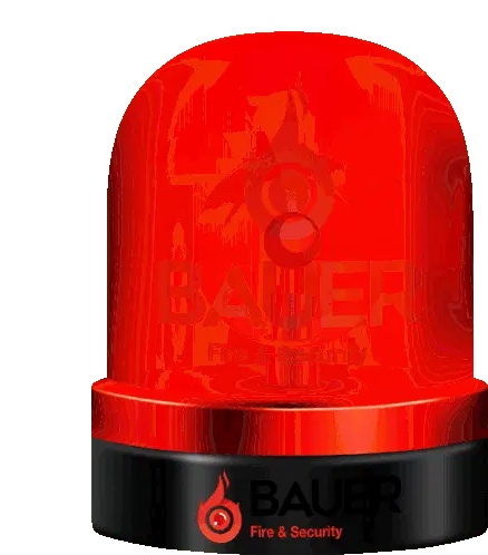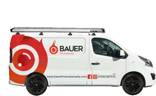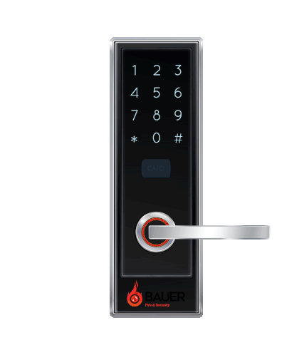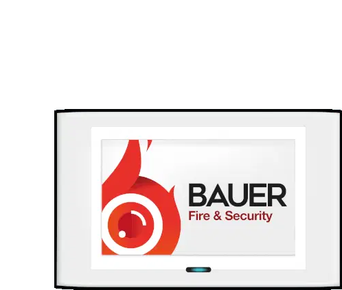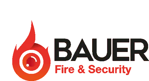 A hand enters a code on a digital door lock, followed by a 3D animation of the Bauer Fire & Security logo.