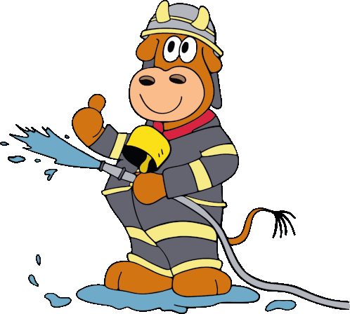 a cartoon of a cow dressed as a fireman spraying water from a hose