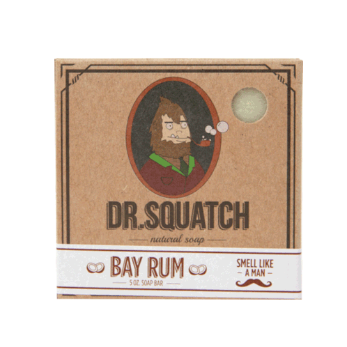 A Dr. Squatch Bay Rum natural soap bar, featuring a cartoon bigfoot character and the slogan 'Smell Like A Man'.