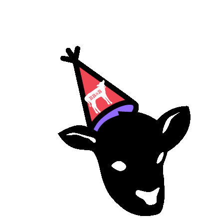 A black goat silhouette wearing a party hat with 'BB&B' and confetti. Perfect for celebrations and fun.