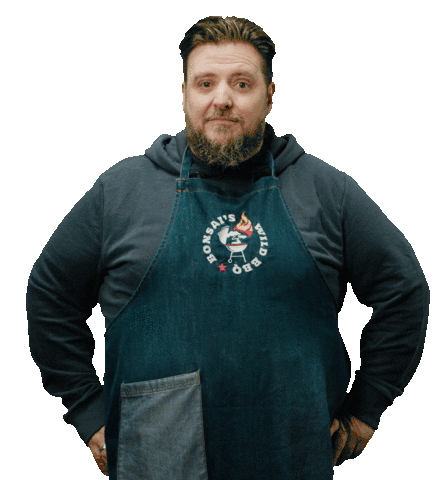 A bearded man in a 'Bonsai's Wild BBQ' apron taps his wrist, gesturing impatiently for someone to hurry up.