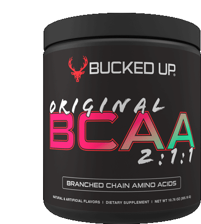 Animated sticker of a Bucked Up Original BCAA supplement container, highlighting the product details.