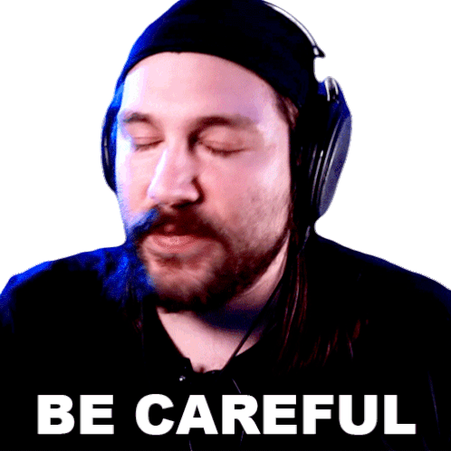 Michael Kupris, wearing a beanie and headphones, looks intently at the camera and warns, 'BE CAREFUL'.