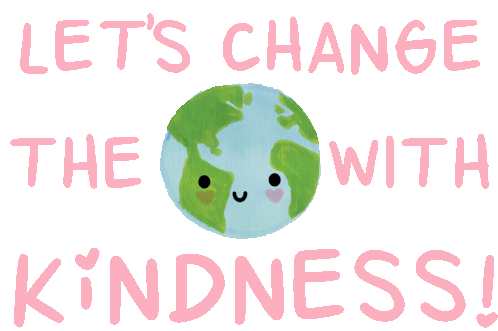 An animated sticker featuring the text 'LET'S CHANGE THE WORLD WITH KINDNESS!' alongside a cute, smiling Earth character.