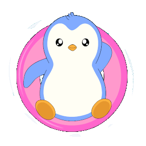 An adorable cartoon penguin happily floats on a bright pink inflatable ring in calm blue water, enjoying a relaxing moment.