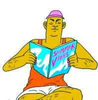 Cartoon man in summer attire reading a book titled 'Summer Vibes', enjoying a relaxed moment.