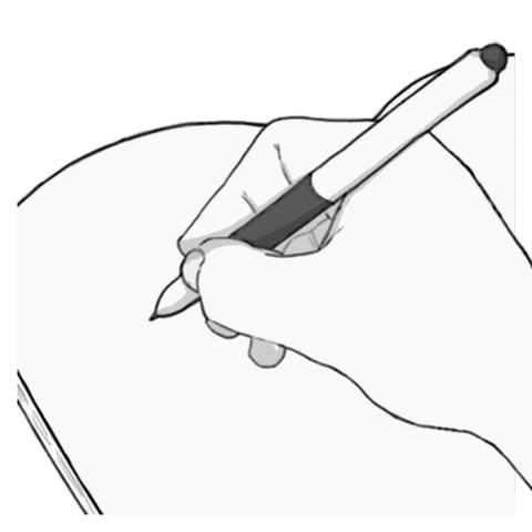 A hand in a black and white line art style writes the uppercase letter 'R' on a blank piece of paper with a pen.