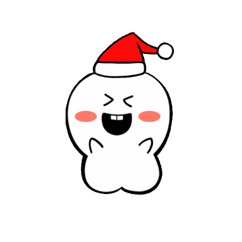 A cute, white cartoon character wearing a Santa hat laughs joyfully with closed eyes and an open mouth, showing teeth.