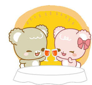 Two adorable cartoon bears, one grey and one pink, happily clink wine glasses at a table, celebrating a special moment.