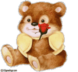 A charming brown teddy bear, wearing a yellow vest, sits and holds a single vibrant red rose gently in its mouth.
