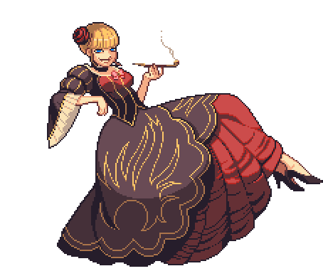 Beatrice from Umineko, depicted in pixel art, reclining elegantly while smoking a long, slender pipe with a confident smirk.