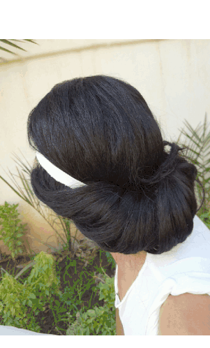 A person's long, dark hair is styled into a large, elegant bun, accented with a white band, showcasing a beautiful and modern hairstyle.