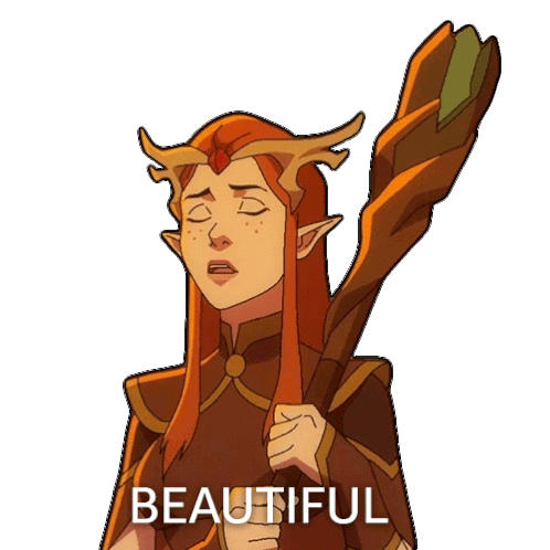 Keyleth from The Legend of Vox Machina reacts with a surprised expression, saying 'Beautiful'.