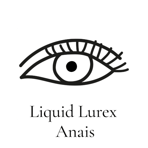 An animated eye with long lashes and eyeshadow, featuring the text 'LIQUID LUREX ANAIS' appearing below it, related to Lisa Eldridge Beauty.