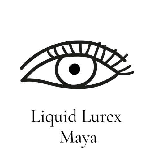 A close-up of an eye with shimmering makeup, featuring the Lisa Eldridge Liquid Lurex Maya brand.