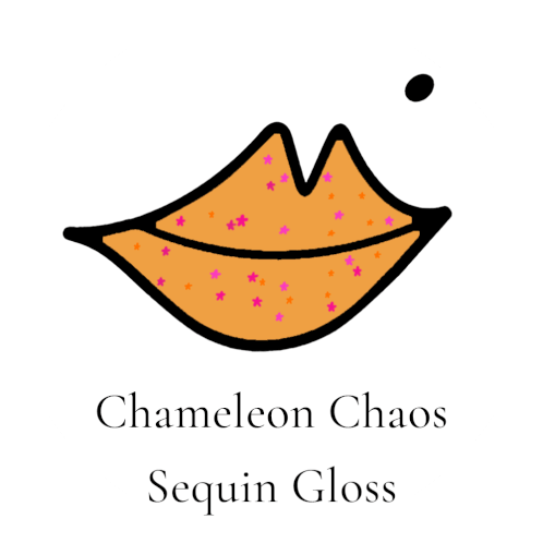 a logo for chameleon chaos sequin gloss with a cartoon mouth