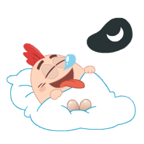 A cute cartoon character, resembling a chicken, is sound asleep under a blanket with a snot bubble and Zzz's, dreaming peacefully.