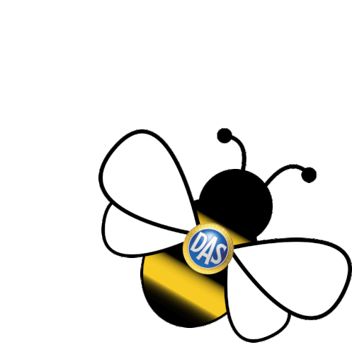 A cute cartoon bee with a 'DAS' logo on its body, gently flying and buzzing, representing legal protection.