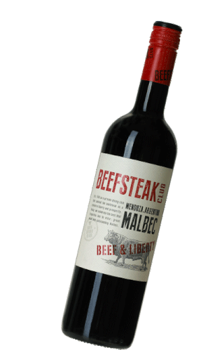 A bottle of Beefsteak Club Malbec wine with a red cap, featuring the 'Raise The Steaks' slogan and 'Mendoza, Argentina'.