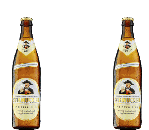 Two animated bottles of Schmucker Meister Pils beer, featuring their distinctive labels and golden caps.