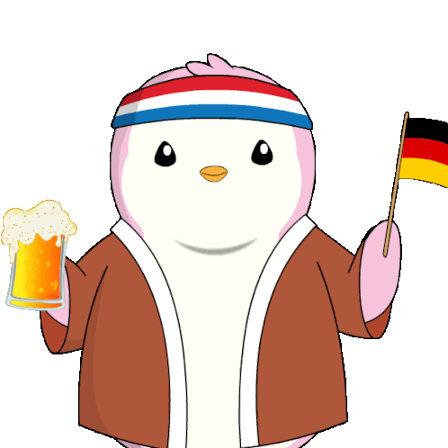 A cute penguin character celebrates with a frothy beer and proudly waves the German flag, ready for Oktoberfest.
