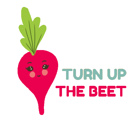 A cheerful cartoon beet character with a big smile joyfully dances, moving its arms and legs in a lively, happy rhythm.