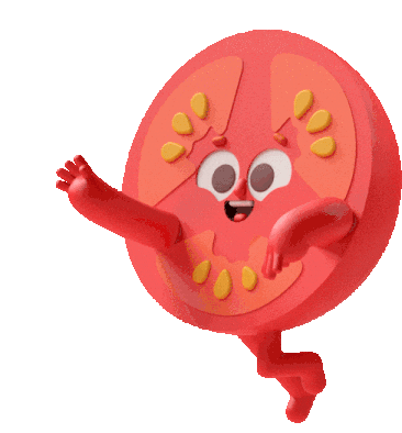 A cute, happy cartoon tomato, depicted as a cross-section, joyfully dances with its arms and legs.