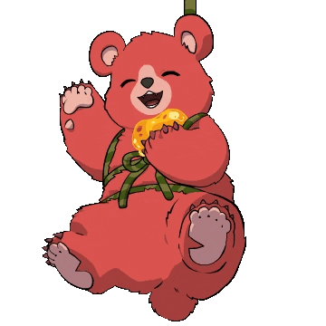 Beh, the cute crimson bear, happily holds a yellow object, possibly honey, and waves goodbye.