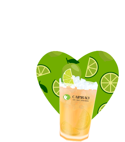 A vibrant heart-shaped background with lime slices and a glass of Caipirao Licorbeirao, garnished with ice and lime.