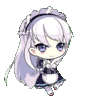 Beldance performs a happy dance as a cute chibi maid with long white hair and sparkling blue eyes.