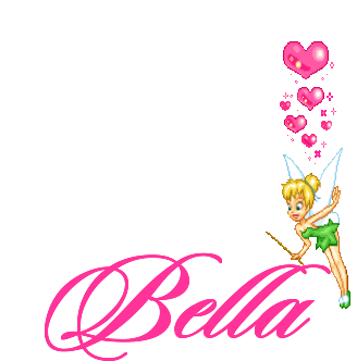 Tinkerbell, the beloved fairy, sits on the name 'Bella' while casting magical pink hearts and sparkles.