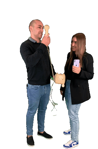 A man uses an old rotary phone while a woman talks on a modern smartphone, highlighting the evolution of communication.