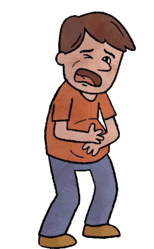 Cartoon man clutching his stomach in discomfort, experiencing a belly ache or stomach pain.