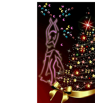 A glowing belly dancer silhouette performs beside a festive Christmas tree, adorned with stars and lights.