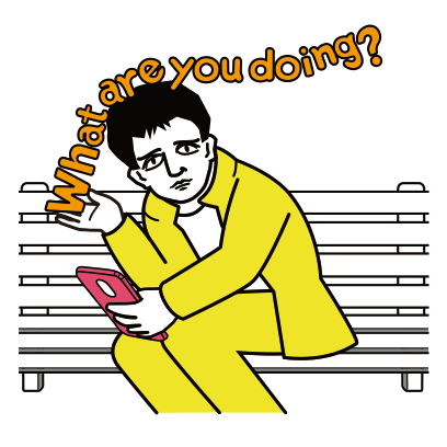 A man in a yellow suit sitting on a bench, looking up from his phone with 'What are you doing?' text.