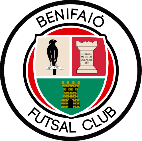 Official logo sticker for Benifaió Futsal Club, featuring a shield with a castle, a bird, and a Latin motto.
